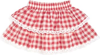 - Features: Red gingham skort with eyelet lace trim