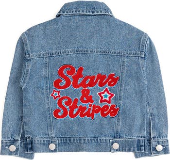 A playful denim jacket topped with a stars and stripes back patch for instant all-American, red-white-and-cute style.