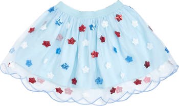 Your little firecracker will be ready to spin and sparkle in this scalloped, sky blue tutu, dusted with a sequined galaxy of red, white, and silver stars for a look that's pure patriotic magic.