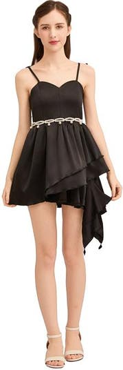• Asymmetrical layered ruffle hemline with high‑low effect