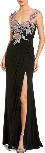 This embellished gown features floral beaded appliqués, a sweetheart neckline, and ruched detailing at the waist, finished with a bold high slit.