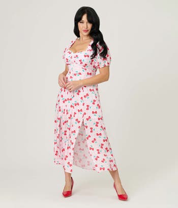 This sweet dress is crafted with a sweetheart neckline that is framed by short Bardot sleeves and features a front button closure. The sweeping midi skirt drops past your knees and boasts dual front vents!