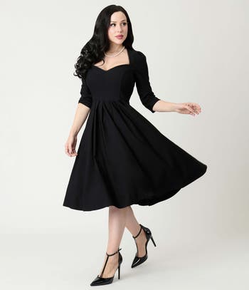 This beautiful dress from Unique Vintage is cast in a fabulous stretch blend fabric. The fitted bodice and sweetheart neckline are framed by three quarter length sleeves. The full knee length swing skirt is set with knife pleats and is nipped in by the back zipper closure!