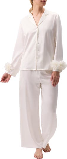 Summon airy, luxurious energy in these lightweight charmeuse pajamas featuring a button-up shirt with detachable chiffon blooms at the cuffs and matching wide-leg pants.