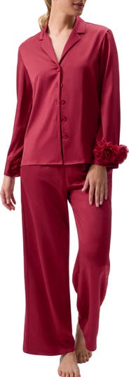 Summon airy, luxurious energy in these lightweight charmeuse pajamas featuring a button-up shirt with detachable chiffon blooms at the cuffs and matching wide-leg pants.