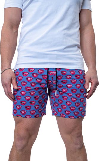 Make a statement from beach to pool in these trunks tailored for a versatile fit from a quick-dry fabric patterned with an irreverent lip-smacking print.
