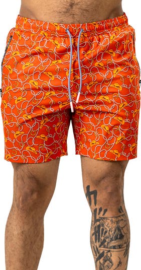 Turn every beach day into a pool party with these boldly patterned swim trunks engineered from ultrasoft, stretchy fabric that eliminates chafing and abrasion. Reinforced pockets securely stow your belongings.