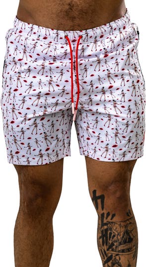Turn every beach day into a pool party with these boldly patterned swim trunks engineered from ultrasoft, stretchy fabric that eliminates chafing and abrasion. Reinforced pockets securely stow your belongings.
