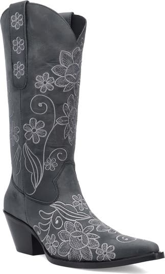 Floral embroidery adds just the right touch of sophistication to a leather Western boot grounded by comfort cushioning.