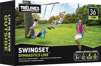 TRELINES: ADVENTURE LINE - SWINGSET 36FT - TOP SELLING ITEM! Can be played with 1 or up to 4 children. The kit includes 36` (12M) Line, 2 Adjustable Swings, 1 Set of Gym Rings and Double Trapeze bar. Create a Swingset and Gymnastics line between 2 trees in a few minutes with easy installation. Perfect for all kids that love the outdoors! Fairly easy setup with no tools needed, except a 6` step ladder. Test your tree`s strength to ensure safety before use. Select the location and measure your desired distance line length. Take down the line in off-season to protect against weathering. Visit our YouTube Channel for more tips. UNLEASH YOUR INNER ADVENTURER: Perfect for backyard parties, family gatherings, or simply enjoying quality time outdoors, this swingset encourages active play, boosts confidence, and creates unforgettable memories that last a lifetime. TRELINES: Where the fun grows on trees. Experience nature like never before with Trelines.