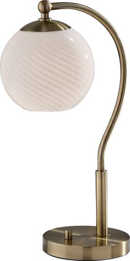 The swirled glass of this antiqued lamp's globe shade helps soften the glow it casts to warm up any space in your home.