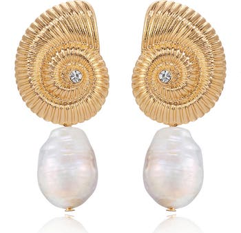 Freshwater pearl drops lend natural luster to these shell-shaped earrings centered with sparkling crystals.