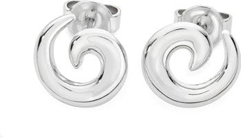 Silver studs with a unique organic shape and style, inspired by the flow of air and wind. These large studs are designed as opposites for each ear, creating a striking effect that frames the wearer's face for added impact.