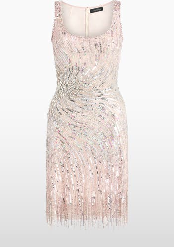 Playful yet sophisticated, this sleeveless dress features intricate embellishment that sweeps across the bodice in a sunburst pattern. The fitted silhouette and delicate beaded fringe create beautiful movement, making it perfect for receptions, parties, or evening events that call for effortless sparkle.