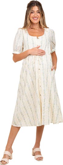 Breeze effortlessly through your pregnancy in our Swiss Dot Floral Print Button Down Maternity Midi Dress. Featuring delicate floral patterns and subtle swiss dot detailing, this dress offers a timeless, feminine charm. The functional button-down front makes nursing easy, while the airy, lightweight fabric keeps you comfortable all day. A flattering midi length, cinched waist, and flowy skirt ensure a beautiful fit before, during, and after pregnancy. Perfect for baby showers, brunches or any special moment, this dress is your go-to for stylish comfort!