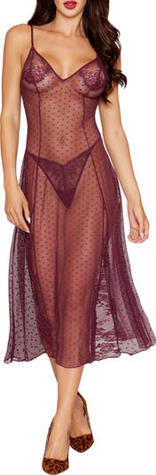 Delicate dots and floral lace bring dimension to a sheer, flowy chemise paired with a matching G-string that completes your after-hours look.