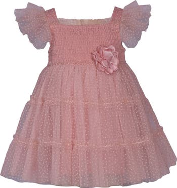 Soft Swiss dots texture this tiered party dress made of lightweight tulle and topped by a stretchy smocked bodice.