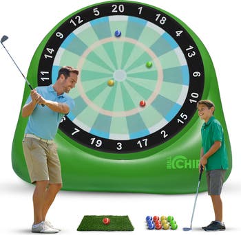 Turn up the fun with this epic golf-and-darts game combo that puts a fresh twist on two all-time favorites! Swing, shoot, and aim for the dartboard to rack up points, then battle it out over 9 action-packed rounds to crown the ultimate champion. Setup is fast and easy—inflate the sturdy board in under 10 minutes and stake it down for rock-solid, wobble-free play. Towering over 8ft tall, this massive game instantly grabs attention and delivers big fun for all ages. Keep the excitement going with exclusive original games like Long Ball, Shoot Out, D-A-R-T-S, Around the World, 301, and War. Built with extra-thick vinyl for lasting durability and backed by our Happiness Guarantee, we’ll replace any damaged parts—even tears or holes after light gameplay—so the fun never stops.