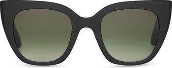 Bold cat-eye frames amplify the contemporary attitude of lightweight, durable sunglasses fitted with gradient, UV-protective lenses.