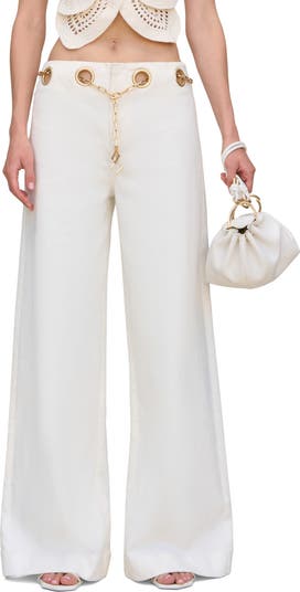 Leg-elongating wide hems and a kiss of stretch shape the silhouette of these polished pants updated with belted goldtone grommets for a touch of edge.