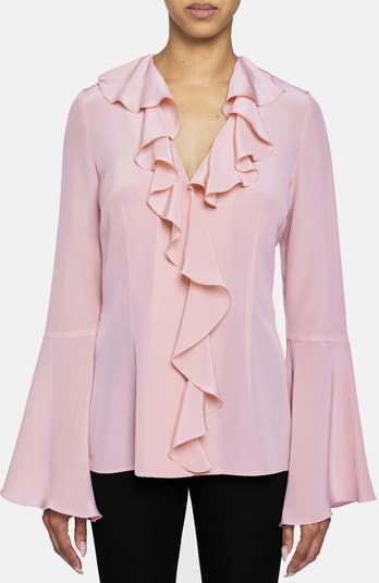 Long Sleeve Ruffle Neck Blouse in Silk Crepe de Chine