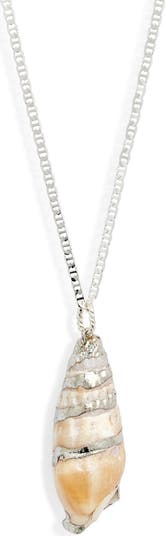 Silver-plated soldering traces the natural curves of seashell at the center of this beachy pendant necklace.