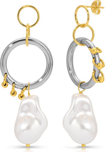 Pierced rings, two-tone shine and uneven lengths contemporize drop earrings glowing with baroque cultured pearls.
