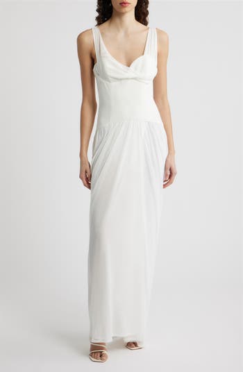 A corseted bodice enhances the sculptural silhouette of this sleeveless gown designed with a draped mesh neckline and a soft gathered skirt.