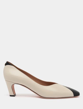This Sylt pump is characterized by the refined interplay of matte white leather and black leather cut-away details on the delicate square toe and above the elegantly curved heel.