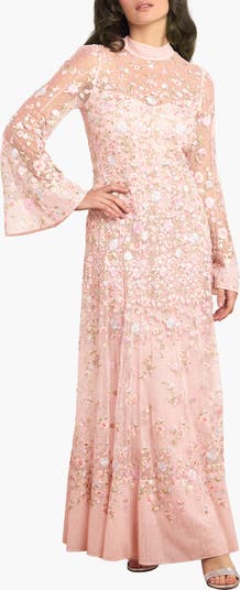 The Sylvia Rose Long Sleeve Ankle Gown. Adorned with delicate floral embroidery cascading in softly graduated bands, this gown offers a romantic, engineered finish. Designed with long sleeves and an elegant ankle-length silhouette for refined occasion dressing.