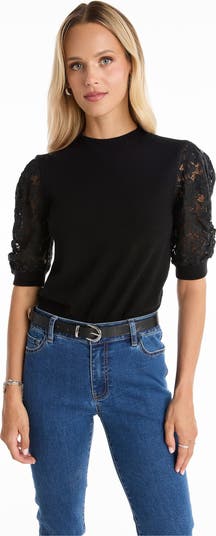 Our crewneck knit, the Sylvie Knit Top, is cut from a soft, knit fabric with blouson short sleeves and a relaxed, slim fit. Designed with a flattering slim fit, this top is a perfect match for your Fall wardrobe. This style features open lace sleeves for added romance and femininity.