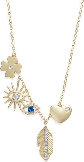 Blue sapphire and white diamonds bring an icy glow to this 18-karat-gold necklace strung with symbols of protection and luck.