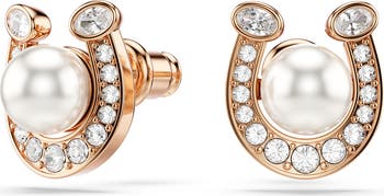A horseshoe design brings equestrian charm to these stud earrings enlivened by center faux pearls and bright pavé crystals.