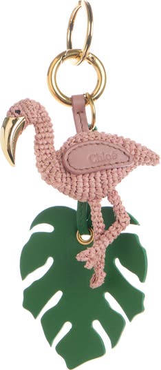 Add a tropical flourish to a favorite bag with this whimsical charm that pairs a crocheted-raffia flamingo with a leather Monstera leaf.