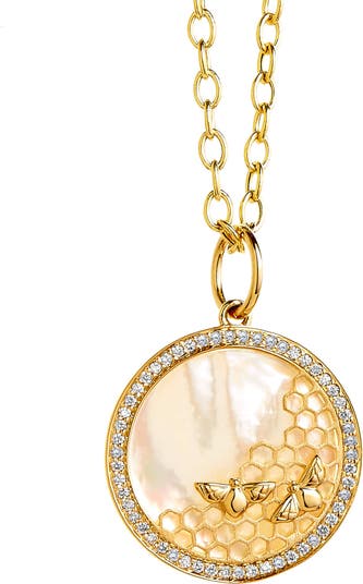 Sculptural and luminous, the Beehive Pendant captures a sense of quiet complexity through layered form and soft light. Crafted in 18K yellow gold, a glowing mother of pearl center is framed within a structured silhouette, accented by diamonds that add a refined brilliance. The design feels both architectural and organic, offering a distinctive statement that balances texture, light, and modern elegance.