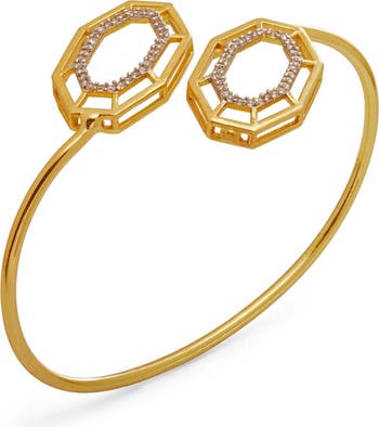 The Syra Bracelet is a handcrafted adjustable bracelet made from brass with 22k gold plating. Geometric forms are accented with white cubic zirconia for sparkle. Lightweight and easy to wear, the bracelet fits comfortably on the wrist.