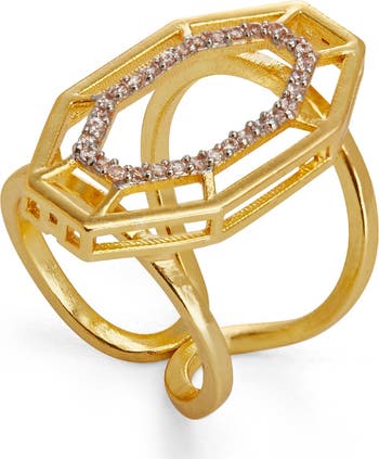 The Syra Ring from the White Space collection is handcrafted in 22k gold-plated brass and accented with brilliant white cubic zirconia. Its adjustable design allows for a comfortable fit, while geometric forms and precise detailing reflect DBJ's signature style.