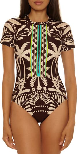Contrast trim pops at the front of a sporty one-piece swimsuit secured by a front-zip closure and featuring short sleeves.