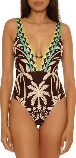 Stroll beachside or lounge by the pool in this tropical print one-piece swimsuit boasting a plunge neck and open back.