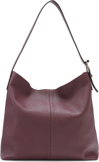 Logo-engraved bar hardware on the buckle-adjustable strap brings this season's signature look to a spacious and slouchy hobo bag in supple, richly-pebbled calfskin. A polished-metal 'McQueen' subtly marks one end.
