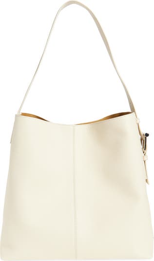 Logo-engraved bar hardware brings this season's signature look to a spacious tote shaped from richly pebbled calfskin in a light, creamy color.