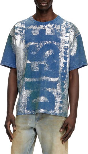 Own that can't-be-tamed aesthetic in this cotton T-shirt marbled with a 'just found in the studio' look, splashed with spray paint color and finished with a foiled partial mask for metallic mayhem.