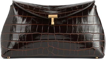 Scandinavian minimalism defines this sculptural clutch made of glossy croc-embossed leather and secured with its namesake T-shaped twist lock on the curved flap.