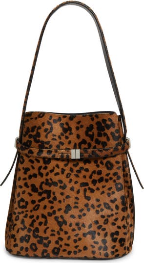 Crafted in Italy of leopard-splashed calf hair, this sculptural clutch is secured with a silvery T-shaped twist lock on the curved flap.
