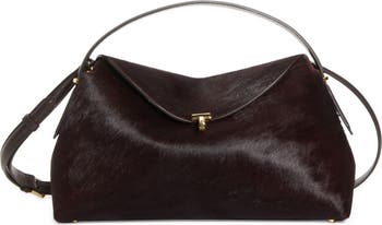 A T-shaped clasp nods to the 'T' in Totême on this softly structured bag crafted of silky genuine calf hair and trimmed with smooth leather. A removable shoulder strap offers another carrying option.