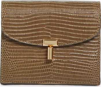 This Spanish-made card case is crafted from lizard-embossed calfskin leather and features signature T-lock hardware at the curved flap for a heritage finish.