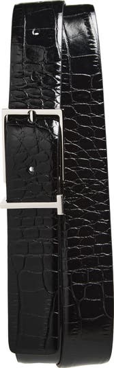 Integrated T hardware sleekly authenticates this Italian-crafted belt made from croc-embossed patent calfskin.