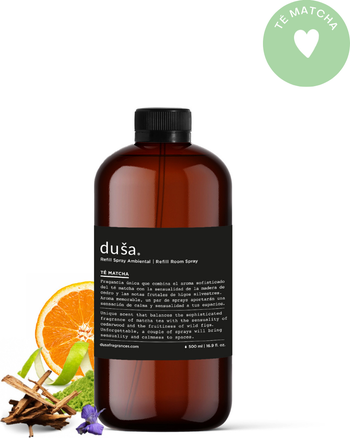 Reduce - Reuse. At duša we are strongly committed with our planet. With our Air Freshener Spray Liquid Refill you can re-use your glass containers and reduce the impact generated on the environment. TASTING NOTES: Orange citrus, notes of matcha tea, fruity fig, Jasmine, pink and violet flowers. Amber, wood and musk. HOW TO USE: Pour content into an empty Duša Room Spray. Last up to one refill. INGREDIENTES / INGREDIENTS : Agua (Water), Alcohol Desnaturalizado (Alcohol Denat), Polisorbato 20 (Polysorbate 20), Fragancia (Fragrance).