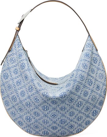 Tory's signature stacked-T monogram ensconced between bead-style gridding creates tile-inspired artistry across a slouchy denim balloon bag suspended from an adjustable shoulder strap.