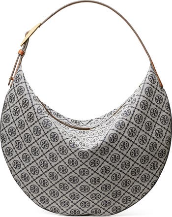 Elegant jacquard boldly emblazoned with Tory's unmistakable stacked-T medallion brings house-signature branding to this crescent-shaped balloon bag.
